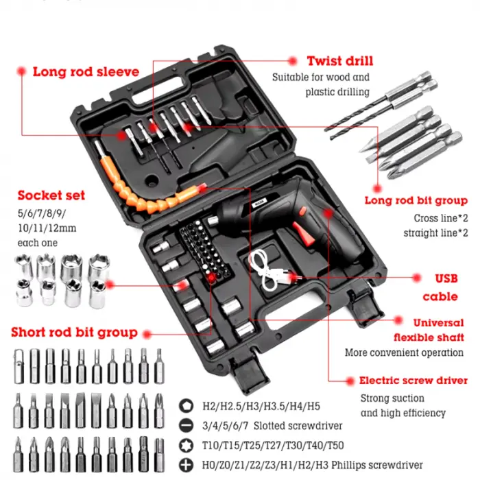 El Kit de Destornillador Inalámbrico de 47 piezas es la herramienta ideal para trabajos de reparación, armado y mantenimiento en el hogar, oficina o taller. Compacto, liviano y fácil de usar, ofrece precisión y comodidad incluso en espacios reducidos.